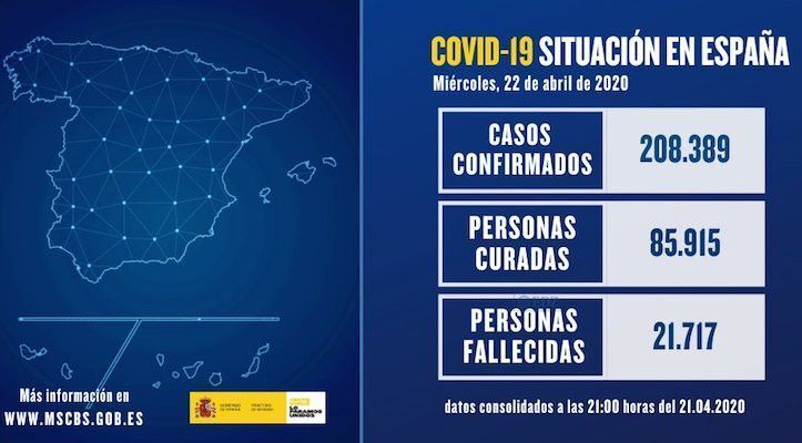 El número de contagios detectados en las últimas 24 horas ha sido de 4.211, y el total de personas que se han recuperado asciende a 85.915, según los datos presentados por el Ministerio de Sanidad. España registraría 208.389 casos y 21.717 fallecimientos, 435 más que ayer.