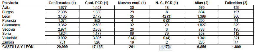 El agradecimiento desde la Consejería de Sanidad de hoy ha sido para "toda la ciudadanía que entiende que estamos en fase cero y que tenemos que mantener las medidas de distancia física". 20.999 casos totales en Castilla y León, 173 confirmados por PCR en las últimas 24 horas.