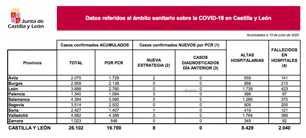 La Consejería de Sanidad, en el día 91 desde la declaración de estado de alarma, ha ofrecido los datos de la evolución del coronavirus en la comunidad, siguiendo una buena línea. En las últimas 24 horas, en Castilla y León, se han registrado 8 casos de la enfermedad COVID-19 (18 casos ayer); aunque, de estos 8 casos, ninguno ha sido diagnosticados en las últimas 24 horas, por primera vez desde marzo. Estos positivos sitúan el número actual en 26.102 personas contagiadas; de esa cifra, 19.700 han sido confirmadas por PCR.