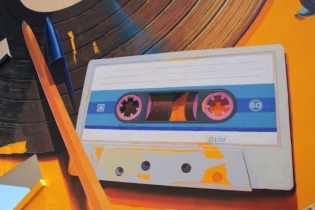 Se trata de un nuevo lienzo urbano en el cual se ve representada una composición de objetos que evocan recuerdos de las décadas de los 80’ y 90’, plasmados desde una perspectiva cenital, según explica el concejal Pablo Novo.