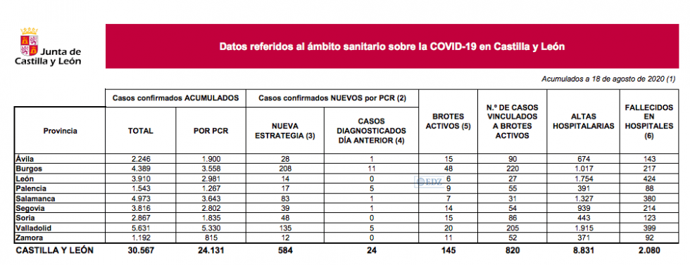 En las últimas horas, se han confirmado 584 nuevos casos de contagios de coronavirus, con lo que su número actual acumulado es 30.567; de esa cifra, 24.131 son confirmaciones a través de pruebas PCR. De los 584 nuevos casos notificados hoy, 24 tienen diagnóstico durante las últimas 24 h. y síntomas", ninguno en Zamora, con 12 de días anteriores o sin síntomas.