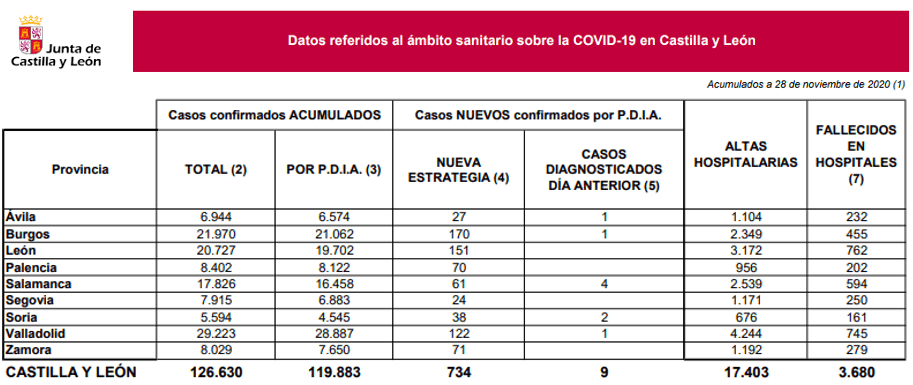 La Consejería de Sanidad de Castilla y León ha informado hoy, 34 días después de que se instaurara el nuevo estado de alarma, de los nuevos datos de la pandemia en la comunidad, evidenciando un aplanamiento de la curva, con 734 nuevos casos de contagios por SARS-CoV-2, cuando el sábado de la semana pasada tuvimos casi el doble: 1.112 casos positivos por SARS-CoV-2 (ayer fueron 772). Así, la cifra de contagios diagnosticados con pruebas de infección activa es 126.630 positivos, de los que 119.883 tienen diagnóstico de pruebas de infección activa.
