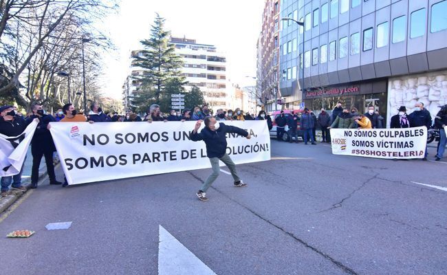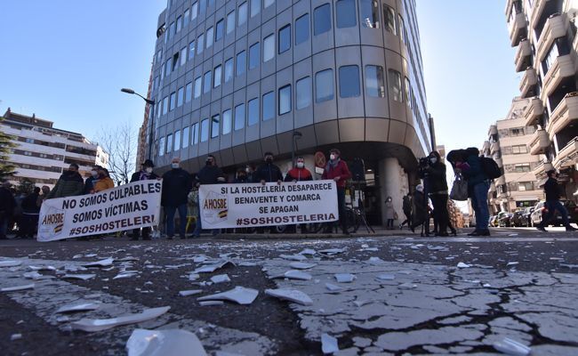 Unos cien empresarios de hostelería de la provincia, entre ellos de la ciudad de Benavente, se concentraron hoy ante la sede de la Delegación de la Junta de Castilla y León, para manifestar su malestar con las decisiones adoptadas por el ejecutivo autonómico. Óscar Somoza, presidente de AZEHOS leyó un largo texto a los allí concentrados, en el que se exigía una serie de medidas a los políticos para evitar la quiebra del sector. La reunión fue pacífica en todo momento, excepción del lanzamiento de huevos sobre la fachada del edificio público. Como colofón, se rompieron platos en la propia calzada. Solo hubo una representación política: la presidenta de VOX Zamora, Marisa Calvo Enríquez.