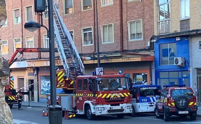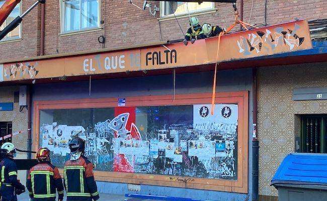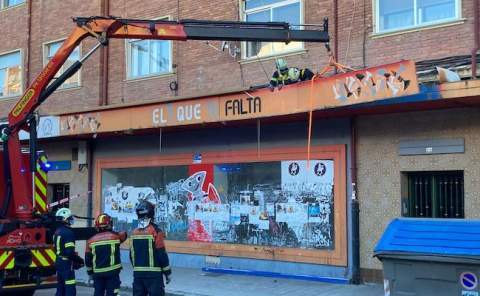 Los Bomberos de Zamora retiran el rótulo de un comercio, peligroso para viandantes