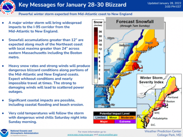 Las inundaciones costeras y las temperaturas extremadamente frías son una posibilidad, advirtió el Centro de Predicción Meteorológica. Y cuanto más fuerte sea la tormenta, mayor será el oleaje de agua a lo largo de la costa.