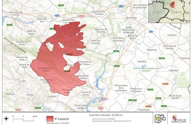 El satélite Copernicus ha mostrado la estimación de lo que es, sin duda, el mayor desastre en la naturaleza de la historia de nuestro país, con una superficie afectada por el incendio de Losacio de 35.960 ha quemadas. Superaría, así, al mayor incendio de nuestro país, el de Minas de RíoTinto, que afectó en el año 2004 a 34.290 ha, según algunas estimaciones, y 29.867, según otros documentos.