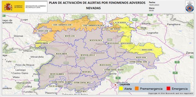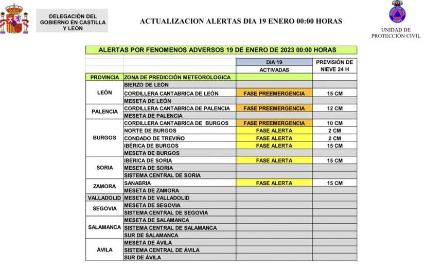 En dicha reunión, se han actualizado los avisos, ante la previsión ofrecida por la AEMET. Así, desde las 00 h., están en fase de preemergencia la Cordillera Cantábrica de León, Palencia y Burgos y en fase de alerta, permanecen zonas del norte de Burgos, Condado de Treviño, Cordillera Ibérica de Burgos y Soria, además de la comarca de Sanabria.
