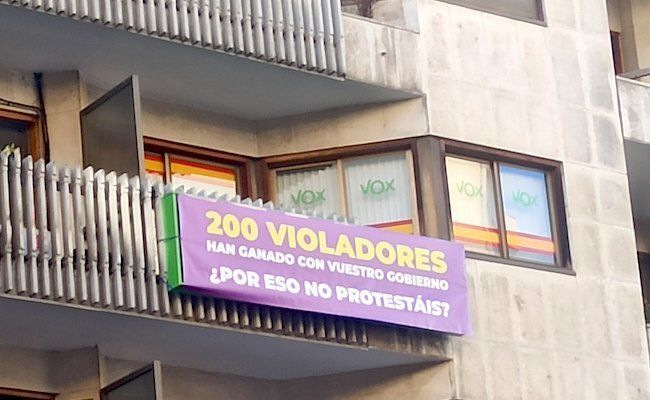 Esperando la llegada de las feministas, las sedes de Vox han amanecido luciendo pancartas con un reto: "200 violadores han ganado con vuestro gobierno, ¿por eso no protestáis?" en el que las feministas no quieren entrar, pues, para ellas, no es más que el lema que demuestra que Vox se ha quedado sin argumentos, pues "no sabemos ¿en qué momento defender nuestros derechos reproductivos se convirtió en estar de acuerdo con la reducción de penas de violadores?".