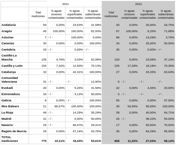 A nivel autonómico, teniendo en cuenta aquellas con un número significativo de mediciones, destaca Galicia con el 97,5% de las mediciones superando el límite legal en aguas subterráneas, el 72% en Aragón y el 70% en Castilla y Léon.