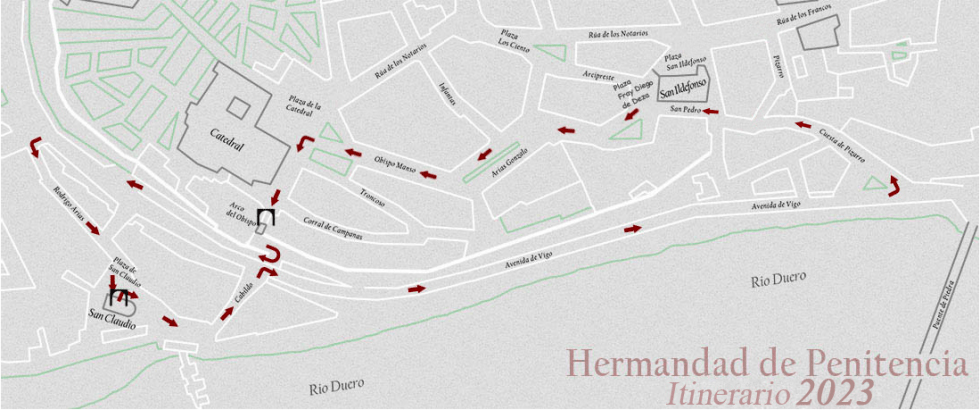 Miércoles 5 de abril de 2023, sale a las doce de la noche de la iglesia parroquial de San Claudio de Olivares para continuar por plaza de San Claudio, calle Cabildo, avenida de Vigo, cuesta de Pizarro, calle de San Pedro, plaza de Fray Diego de Deza (donde se reza el Vía Crucis al paso de la procesión), plaza de Arias Gonzalo, calle del Obispo Manso, plaza Antonio del Águila, puerta y cuesta del Obispo, calle Trascastillo, calle Rodrigo Arias, plaza de San Claudio (donde se canta el miserere alistano), para concluir en el templo de partida.