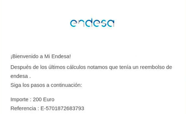 Se ha detectado una campaña de suplantación a Endesa, a través de correos electrónicos fraudulentos, donde se le comunica a la víctima un supuesto fallo de facturación que le reportará un ingreso en su cuenta de 200 €. Para ello, solicitan el acceso a una plataforma maliciosa que suplanta la imagen de la empresa en la que se muestra la cantidad del falso reembolso. El objetivo del fraude es la obtención de información personal y bancaria.