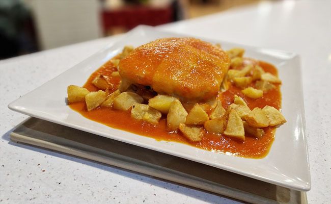 Horneamos hasta que el queso se funda, retiramos del horno y bañamos con la salsa caliente. Servimos con una guarnición de patatas fritas.