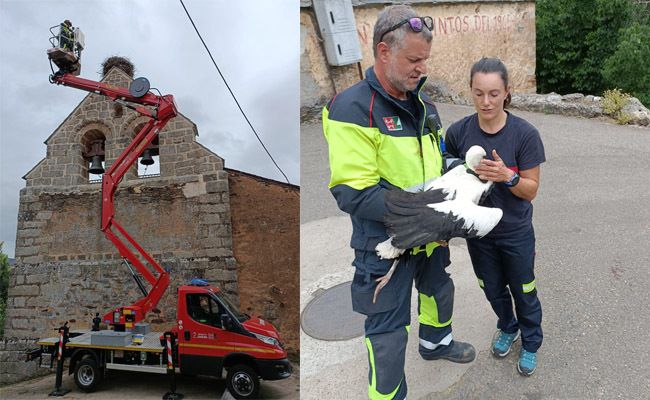 Efectivos del Parque de Bomberos del Parque Tierras de Aliste, perteneciente al Consorcio Provincial de Prevención y Extinción de Incendios, Salvamentos y Protección Civil de la Diputación de Zamora, han llevado a cabo un operativo de rescate en el campanario de la iglesia de Palazuelo de las Cuevas. La intervención se produjo tras recibir un aviso de los vecinos, quienes observaron que una cigüeña tenía dificultades para volar debido a que sus patas estaban enredadas en cuerdas que había llevado al nido.
