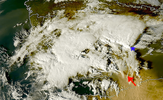 Imagen IR de Meteosat obtenida a las 20 horas locales del 3 de septiembre de 2023. Las "calles" nubosas procedentes del norte de África y que alcanzan el centro peninsular reflejan un flujo de niveles medios y altos que se hace difluente sobre esa zona del centro desarrollando grandes estructuras convectivas.