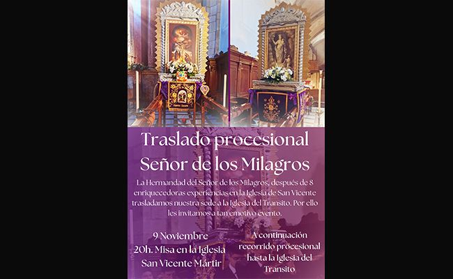 La Hermandad del Señor de los Milagros ha anunciado este traslado en el que cita que "después de 8 enriquecedoras experiencias en la Iglesia de San Vicente, trasladamos nuestra sede a la Iglesia del Tránsito", invitando a todo el que quiera acudir a dicho traslado.