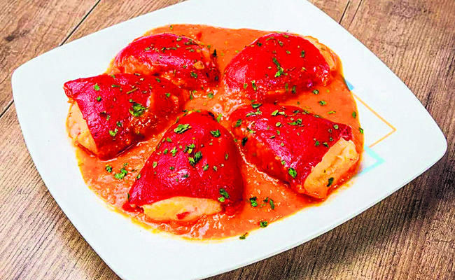 Cuando este fría la carne, la metemos en una manga pastelera y vamos rellenando los pimientos uno por uno. Metemos los pimientos rellenos en una fuente y los cubrimos con la salsa de piquillo que habíamos hecho. Calentamos y servimos.