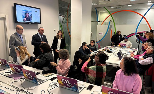 Ortega ha recordado que “los Espacios CyL Digital permiten que los ciudadanos y empresas aprendan de forma gratuita desde lo más básico como reservar una cita en la app Sacyl Conecta, a formación más profesional como actualmente sucede con la inteligencia artificial o el Chat GPT, curso al que asistimos en el día de hoy”.