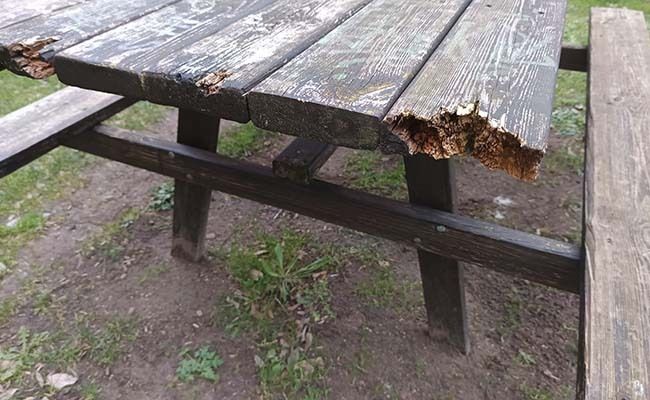 Es evidente cómo varias tablas presentan en sus extremos los estragos del paso del tiempo: están abiertas y, en algunos casos, en condiciones peligrosas. Esto es especialmente preocupante si se tiene en cuenta que en las inmediaciones hay una zona de juegos infantiles, lo que aumenta el riesgo de que alguien pueda sufrir un accidente al clavarse una astilla, por descuido.