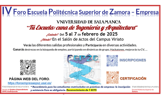 Los días 5, 6 y 7 de febrero, en la Escuela Politécnica Superior de Zamora tendrá lugar el IV Foro Universidad – Empresa de la Escuela Politécnica Superior de Zamora, en el que participa la propia Escuela, la Universidad de Salamanca, así como diferentes entidades públicas y privadas