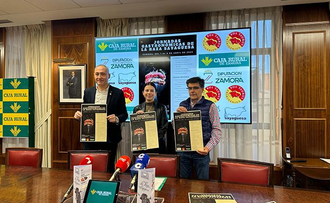 El presidente de la Asociación de la Raza Sayaguesa, Antonio Domínguez, ha estado acompañado por el diputado de Desarrollo Económico, Emilio Fernández, y la técnico de Comunicación de la Fundación Caja Rural, Laura Huertos, en la presentación de estas jornadas, que se celebrarán del 1 al 6 de abril.