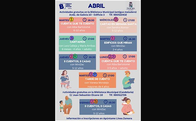 Todas las actividades son gratuitas. Será necesaria la inscripción previa a través de “Apúntame Línea Zamora”. Para ampliar información sobre estas actividades en la Biblioteca Municipal de avda. de Galicia (980510432) y Biblioteca Municipal c/ Juan Sebastián Elcano (980512726).