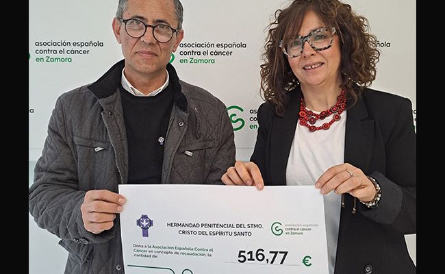 La Asociación Española Contra el Cáncer de Zamora quiere expresar su más sincero agradecimiento a la Hermandad Penitencial del Santísimo Cristo del Espíritu Santo por el generoso donativo de 516.77€ entregado a través de su Presidente D. Antonio de la Higuera.