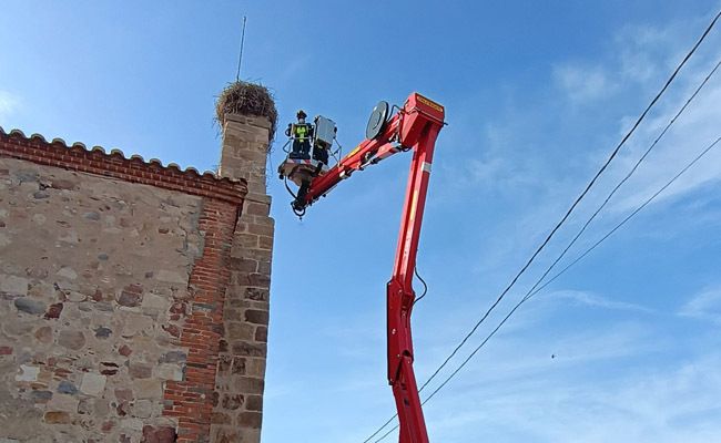 Una dotación del Parque de Bomberos Zona Centro del Consorcio Provincial de Prevención y Extinción de Incendios, Salvamentos y Protección Civil de la Diputación de Zamora, con base en el Parque de Maquinaria de la Institución Provincial en la capital zamorana, se ha desplazado en la mañana de hoy a la localidad de Entrala tras recibir un aviso del Centro de Emergencias de Castilla y León 112, alertando de la presencia de un ejemplar de cigüeña atrapado en su nido, ubicado en una estructura de altura.