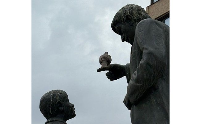 Circundada por árboles de distintos géneros y jardinillos, ese espacio urbano se ha convertido en apetecible para descansar de la vida en cualquiera de sus bancos de madera o restaurar los cuerpos en las terrazas que allí se ubican. Pero no quiero glosar la excelencia de vinos de Toro, ni las refrescantes cañas, ni de las viandas que las cocineras preparan para los paladares más exquisitos, sino escribir de esos instantes líricos que nos depara la vida. Verbigracia. Cuando el ocaso de unos de estos días de julio se apoderaba del cielo, una paloma se posaba en el dedo anular de la escultura del maestro, dibujando un momento especial: hice propios los versos que escribió la columba buscando la rima en la obra de arte del gran escultor zamorano. La cámara de mi móvil captó ese instante que registrará mi memoria hasta las parcas me vengan a buscar. Porque la vida, más en Zamora, todos los días escribe poemas que no todos saben apreciar ni leer. Yo sé que el agua de esa fontana ha servido para escribir apasionados versos de amor.