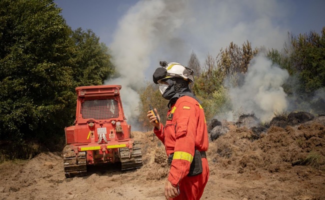 Unidades de la UME, de los batallones de Intervención en Emergencias 5, con base en León, y la Sección Aerotransportada del batallón 4, que han llegado desde la Base Aérea de Zaragoza, realizan misiones de ataque directo contra el fuego y perimetración con maquinaria, para frenar su avance y proteger el entorno, en la zona del incendio de Molezuelas de la Carballeda.