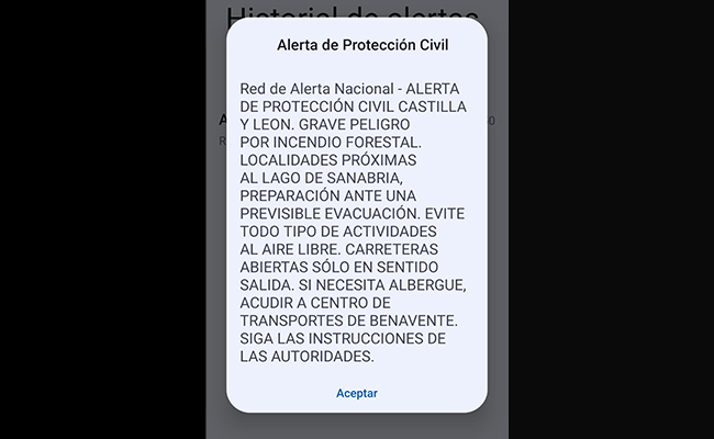 Debido a la evolución del incendio de Porto que sigue en IGR 2, la Agencia de Protección Civil y de Emergencias de la Junta de Castilla y León ha lanzado una ES -Alert a través de los móviles a toda la población del lago de Sanabria y alrededores para que sigan las instrucciones en las que se pone: “Alerta de Protección Civil Castilla y León. Grave peligro por incendio forestal. Localidades próximas al lago de Sanabria, preparación ante una previsible evacuación. Evite todo tipo de actividades al aire libre, carretera abierta solo en sentido salida. Si se necesita albergue, acudir al centro de transportes de Benavente. Siga las instrucciones de las autoridades.”