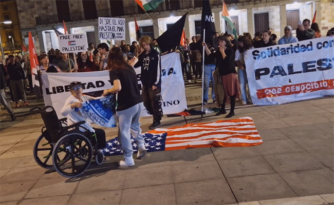 Uno de los momentos de cierta tensión se produjo frente al Gobierno Civil, cuando una activista intentó quemar una camiseta del equipo ciclista israelí y pateó una bandera de Estados Unidos, sin que el incidente pasara a mayores. La concentración se disolvió poco después de la lectura del manifiesto, con gritos de “¡Viva Palestina libre!” y aplausos en apoyo a la causa.