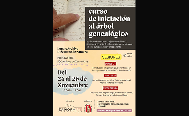 La Fundación ZamorArte, en colaboración con la Diócesis de Zamora, pone en marcha el Curso de iniciación al árbol genealógico: descubre tus orígenes familiares, una propuesta formativa concebida para despertar el interés por la genealogía y facilitar las herramientas necesarias para emprender la reconstrucción de la historia familiar.
