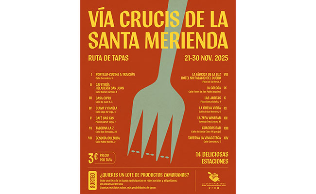 La Santa Merienda lleva por bandera la gastronomía y la cultura, con un papel preponderante de la Semana Santa. Para conmemora el hito de los 10 años de su fundación, La Santa Merienda puso en marcha el año pasado esta ruta gastronómica con una gran aceptación por parte de hosteleros y público en general. Por ello, ha organizado esta segunda edición que tendrá lugar del 21 al 30 de Noviembre, y en la que se podrán degustar tapas exclusivamente diseñadas para la Asociación en 14 establecimientos de Zamora.