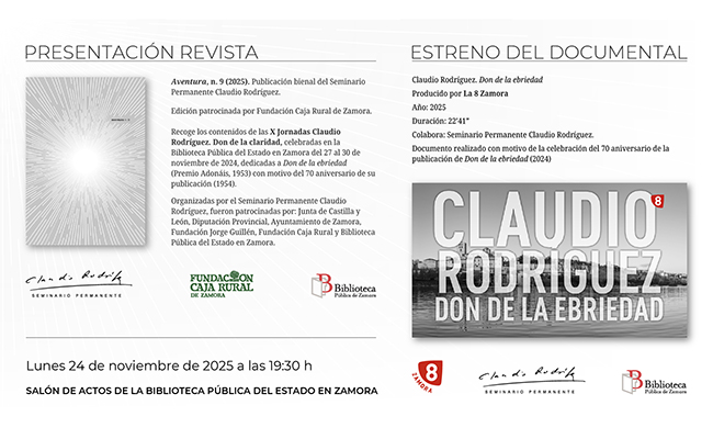 Claudio Rodríguez, Don de la ebriedad realizado por La 8 de Zamora con motivo de la celebración de los 70 años de la publicación de su libro en 1954, que ha contado con la colaboración del Seminario Permanente Claudio Rodríguez. Agradecemos a La 8 de Zamora y a su directora. Eva Crespo, su estreno este lunes (24 de noviembre) en el salón de actos de la Biblioteca Pública del Estado.