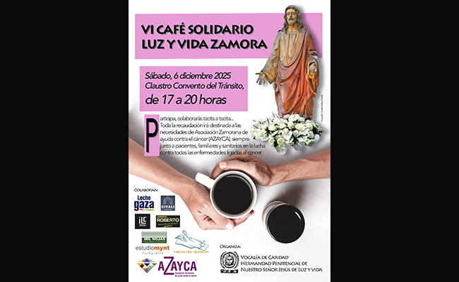 La Hermandad Penitencial de Nuestro Señor Jesús de Luz y Vida de Zamora convoca a hermanos y ciudadanos a participar en la sexta edición de su tradicional Café Solidario, que tendrá lugar el sábado 6 de diciembre de 2025, de 17:00 a 20:00 horas, en el claustro del Convento del Tránsito (Clarisas del Tránsito, Zamora).