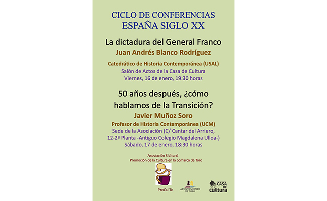 La Asociación Cultural Promoción de la Cultura en la comarca de Toro organiza un ciclo de conferencias sobre la Historia de España del siglo XX de la que forman parte dos conferencias que se desarrollarán el viernes y el sábado. Más adelante seguiremos con otros períodos y aspectos de la historia de este país durante la centuria pasada.