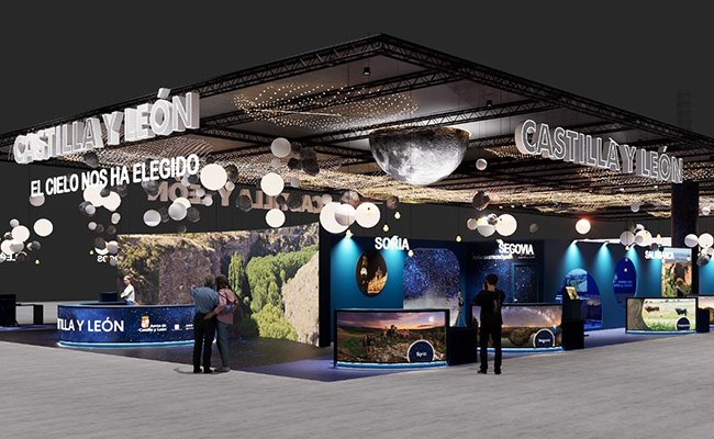 ‘Castilla y León, el cielo nos ha elegido’ posiciona a la Comunidad como territorio ideal para observar el cielo nocturno y los eclipses previstos en 2026 y 2027. El stand recrea el efecto visual de un cielo estrellado y el paso de estrellas fugaces, generando un efecto visual llamativo y de impacto. En este cielo aparecerán suspendidos diversos elementos decorativos, de diversos materiales, texturas y tamaños, que simulan asteroides, satélites, estrellas y otros cuerpos celestes. En el centro de toda esta estructura celeste destaca una media cúpula de más de tres metros de diámetro que evoca la superficie lunar y se convierte en uno de los elementos más singulares del stand.