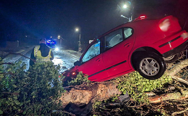 Un conductor debido a la intensa lluvia, no se percató de un obstáculo en la calzada, un árbol caído por el temporal, impactando con el árbol.