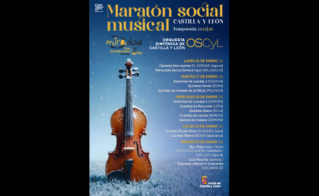 La Orquesta Sinfónica de Castilla y León informa de la suspensión de todos los conciertos programados para el miércoles 28 de enero de 2026 dentro del XII Maratón Social Musical de Invierno, debido a las adversas condiciones meteorológicas que afectan a diversos puntos de la Comunidad y que impiden garantizar la seguridad en los desplazamientos del personal y de los grupos musicales.