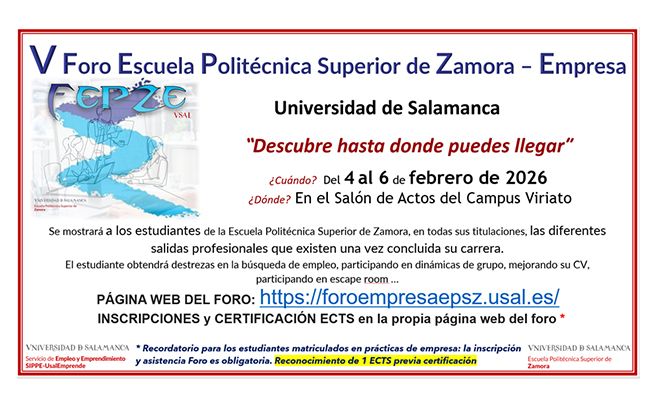Los días 4, 5 y 6 de febrero, en la Escuela Politécnica Superior de Zamora tendrá lugar el V Foro Universidad – Empresa de la Escuela Politécnica Superior de Zamora, que organiza la propia Escuela y en el que se contará con la participación y organización de la Universidad de Salamanca, así como diferentes entidades públicas y privadas.