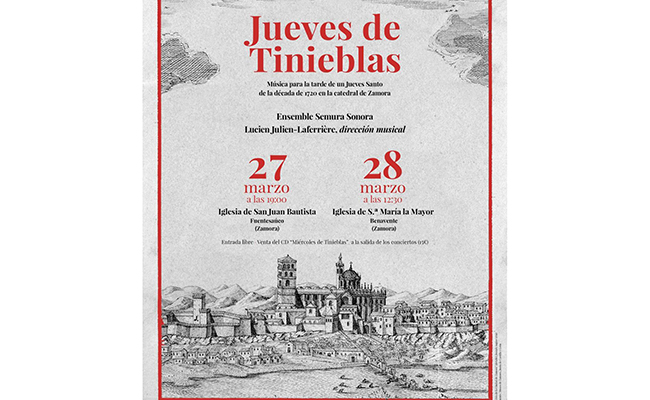 Por tercer año, la Diputación de Zamora patrocina el ciclo de conciertos de Semana Santa organizado por el Ensemble Semura Sonora. En esta ocasión, y con el título ‘Jueves de Tinieblas. Música para la tarde de un Jueves Santo de la década de 1720 en la Catedral de Zamora’, este grupo centrado en la interpretación de música antigua ofrecerá dos actuaciones en Fuentesaúco, el 27 de marzo, y en Benavente, el 28 de marzo, bajo la dirección musical de Lucien Julien-Laferrieère.