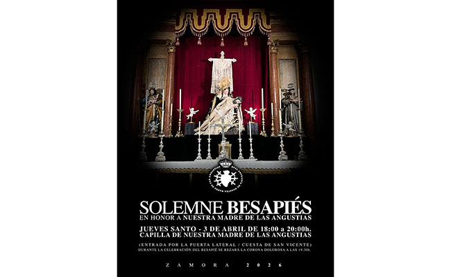 La Real Cofradía de Nuestra Madre de las Angustias anuncia la celebración del Solemne Besapiés en honor a Nuestra Madre de las Angustias, uno de los actos más íntimos y significativos de la Semana Santa zamorana.